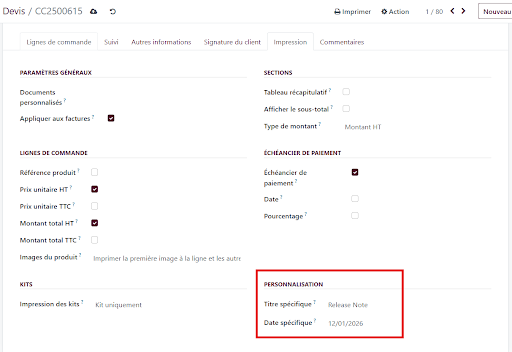 - Enfin, lorsque le mode de confirmation manuelle est activé, la date du jour est automatiquement renseignée à la confirmation du devis, afin d'assurer une datation cohérente des documents. Il est également possible d'adapter le titre du rapport et d'autres champs à l'impression, pour répondre à des exigences spécifiques (organismes, aides, etc.).